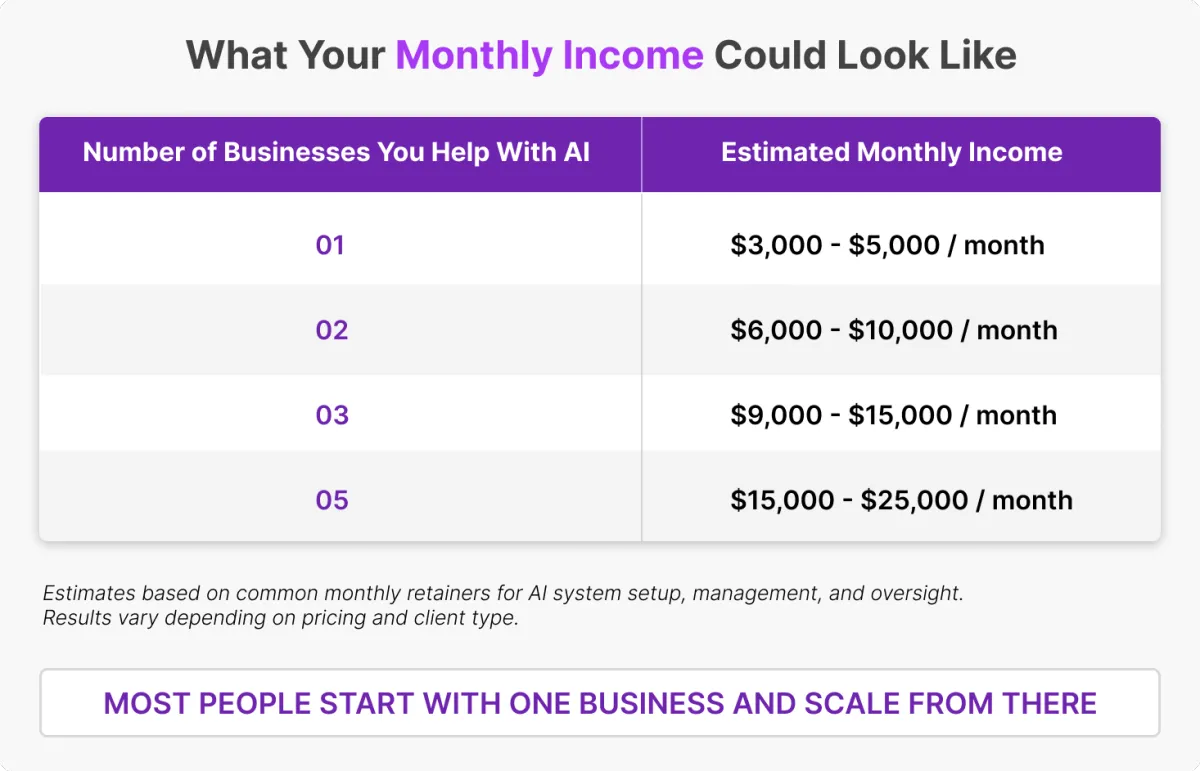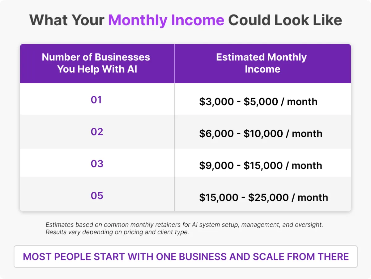 Within days, you’ll be known as the AI consultant local businesses call when they want to save time, cut costs, and grow.